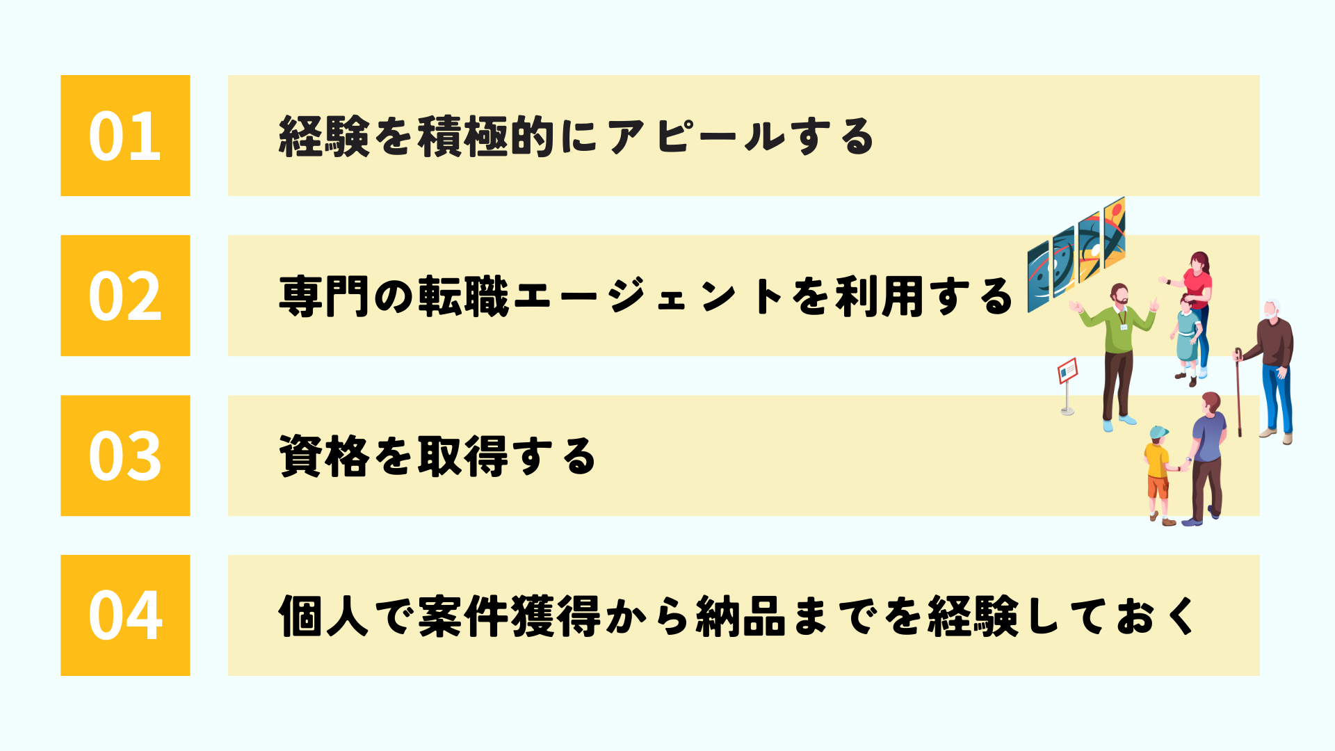 ディスプレイ業界内で転職する場合、成功するためにも取り入れて欲しいポイントがあります。そのポイントを4点にまとめましたので、それぞれ詳しく解説します。