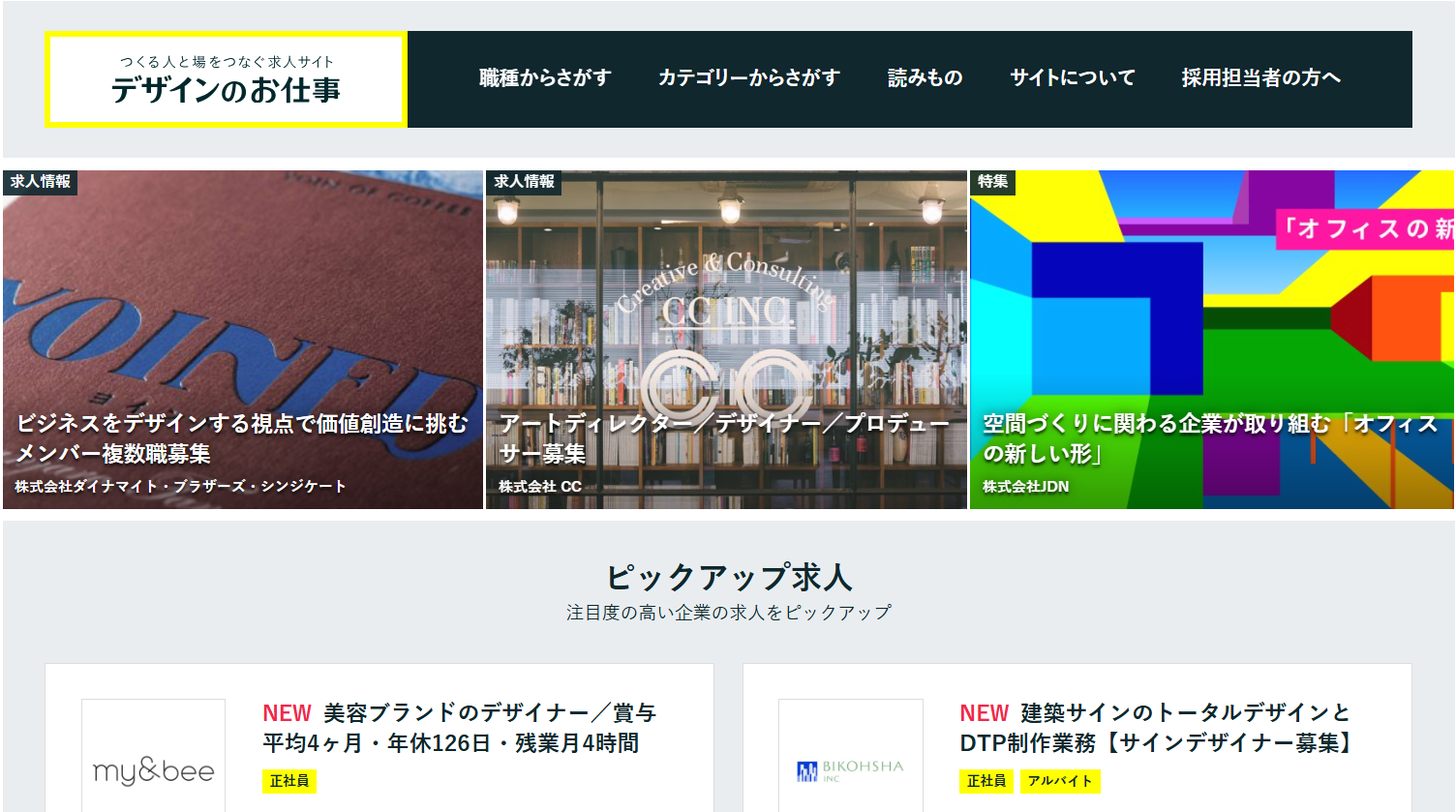 「デザインのお仕事」は、グラフィックやWebだけでなく、空間・ディスプレイデザインの求人も多く扱う、デザイン職専門の求人サイトです。大手からデザイン事務所まで掲載企業の幅が広く、公開求人数は累計1万件以上とされています。