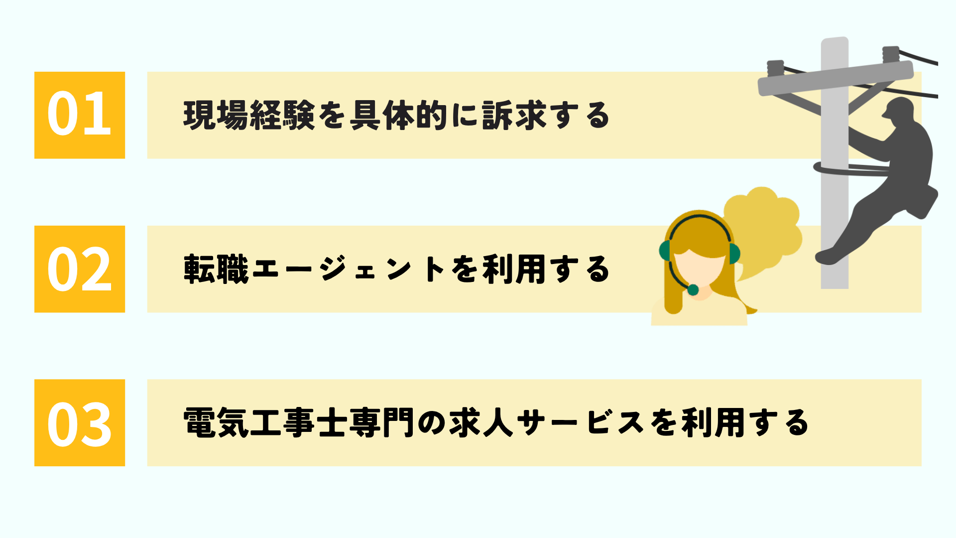 年収を増やす方法として、現在のスキルを活かしたキャリアアップ転職を方法として挙げました。転職をする際、電気工事士として年収を上げるためにも抑えておきたいポイントがあります。