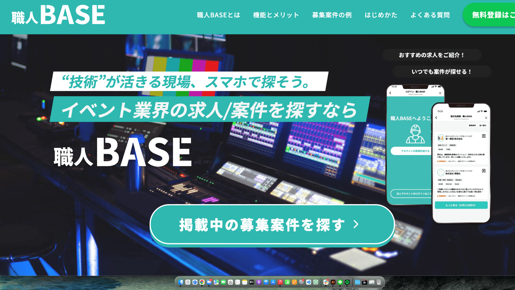 照明オペレーターとして積み上げてきた現場経験を、転職という形で次のキャリアにつなげたい人にオススメのサービスが「職人BASE」です。職人BASEは、イベント業界に特化した人材マッチングサービスで、照明・音響・映像など技術職経験者を前提にした求人が多く掲載されています。