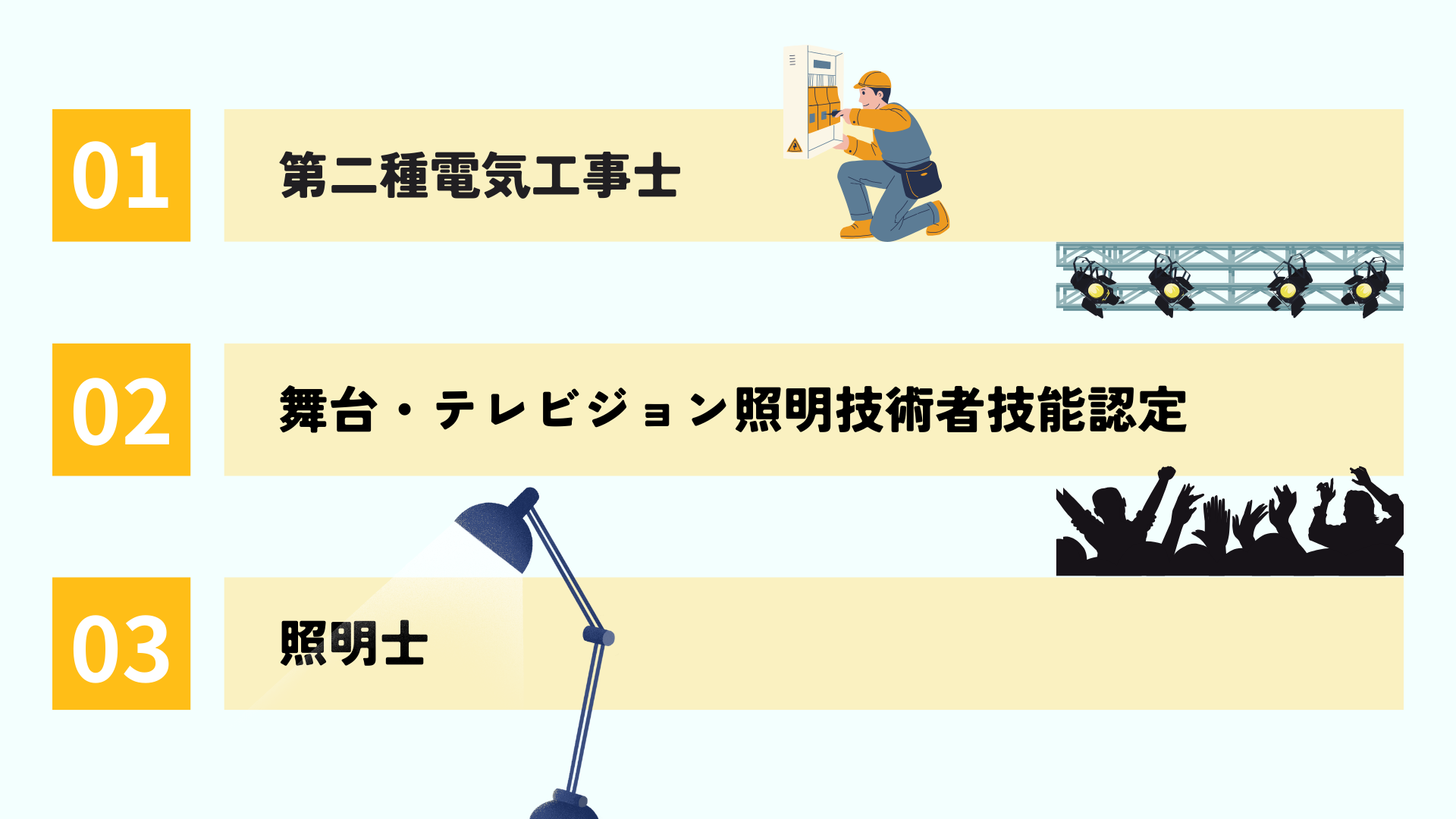 照明オペレーターは必ずしも資格が必要ではありません。しかし、市場ニーズにあった自分の価値を高めてくれる資格は、転職の際に有利に働きます。ここで、転職が有利になる資格を3点ピックアップしましたので、それぞれ詳しく解説していきます。