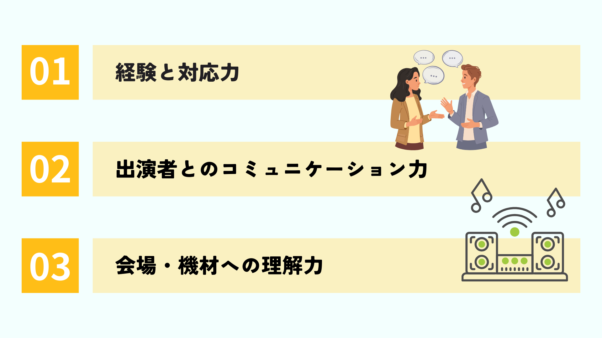 現場で評価されるのは、派手な音づくりだけではありません。会場条件を踏まえ、安全かつスムーズに進行させられるか。その積み重ねが、「また一緒にやりたい」と思われる理由になります。